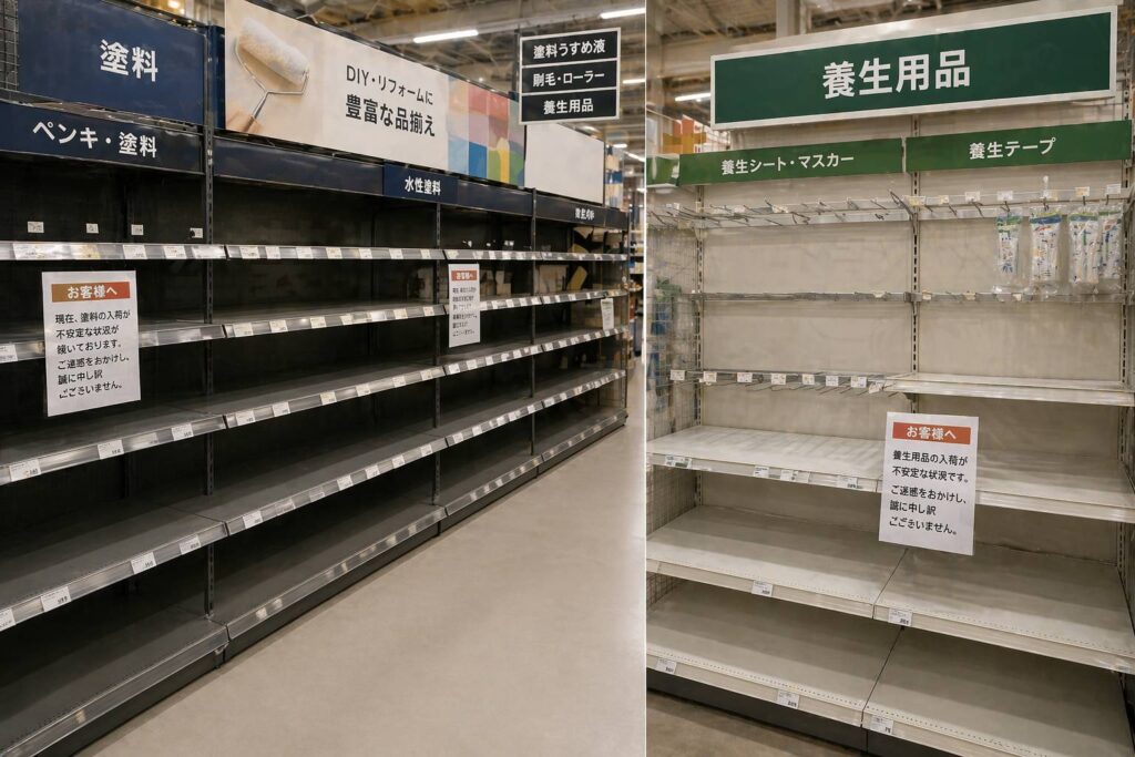 その影響は塗料だけでなく、養生資材や周辺製品にまで広がっており、工事全体の進行にも影響を及ぼしています。